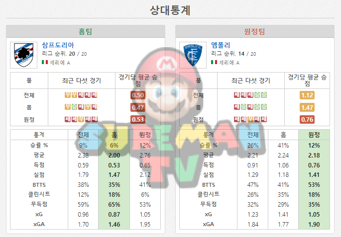 ◆ 삼프도리 vs 엠폴리 세리에A 해축 축구분석